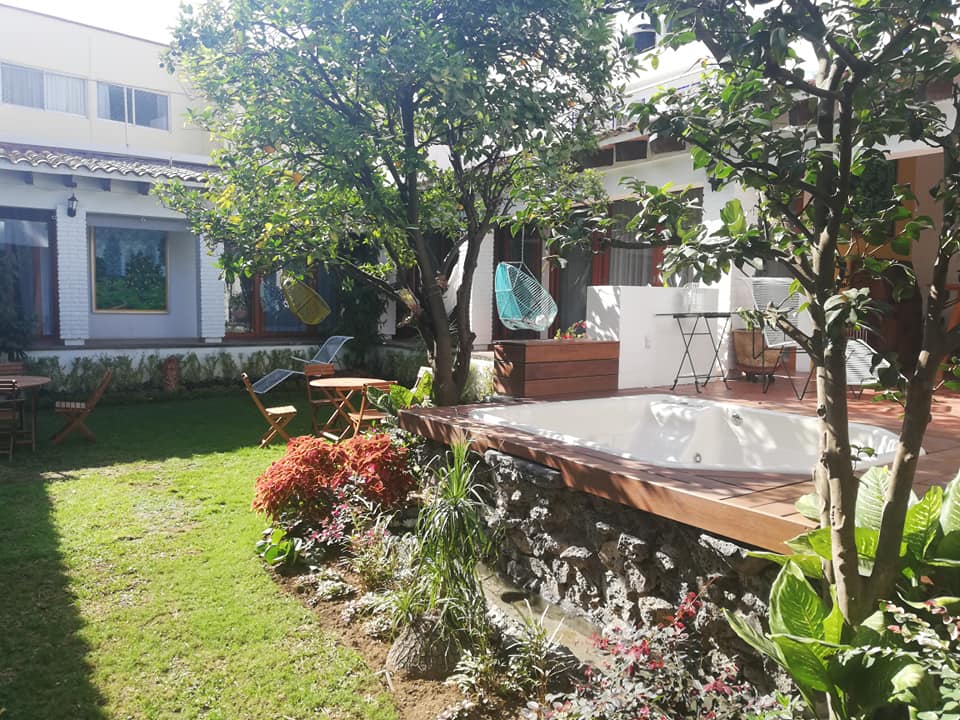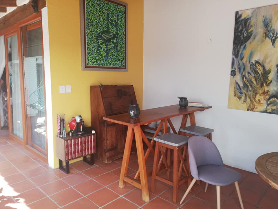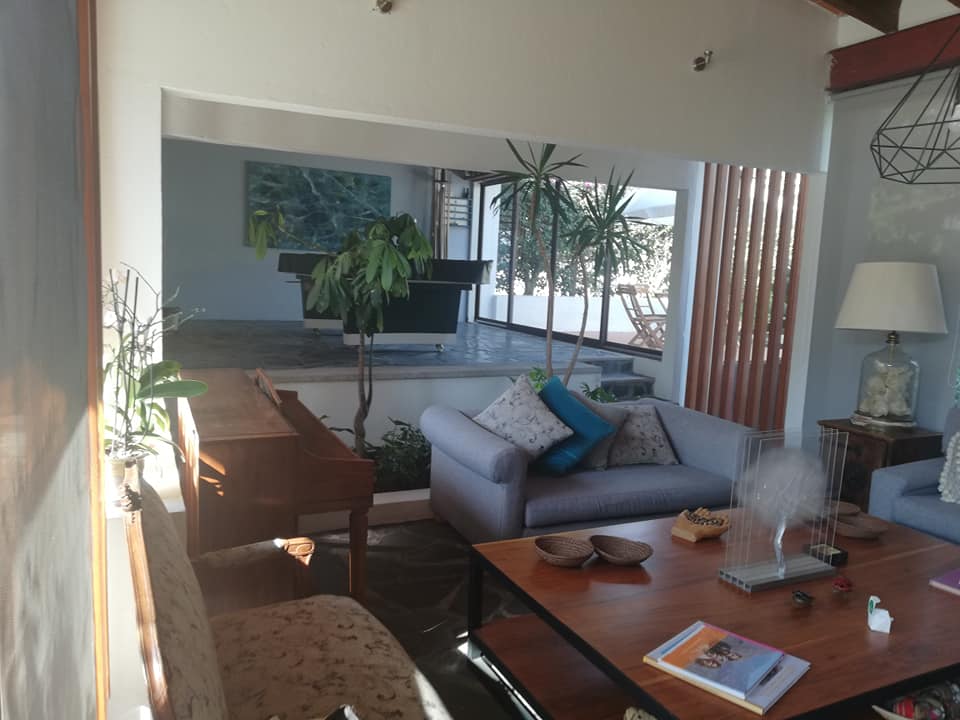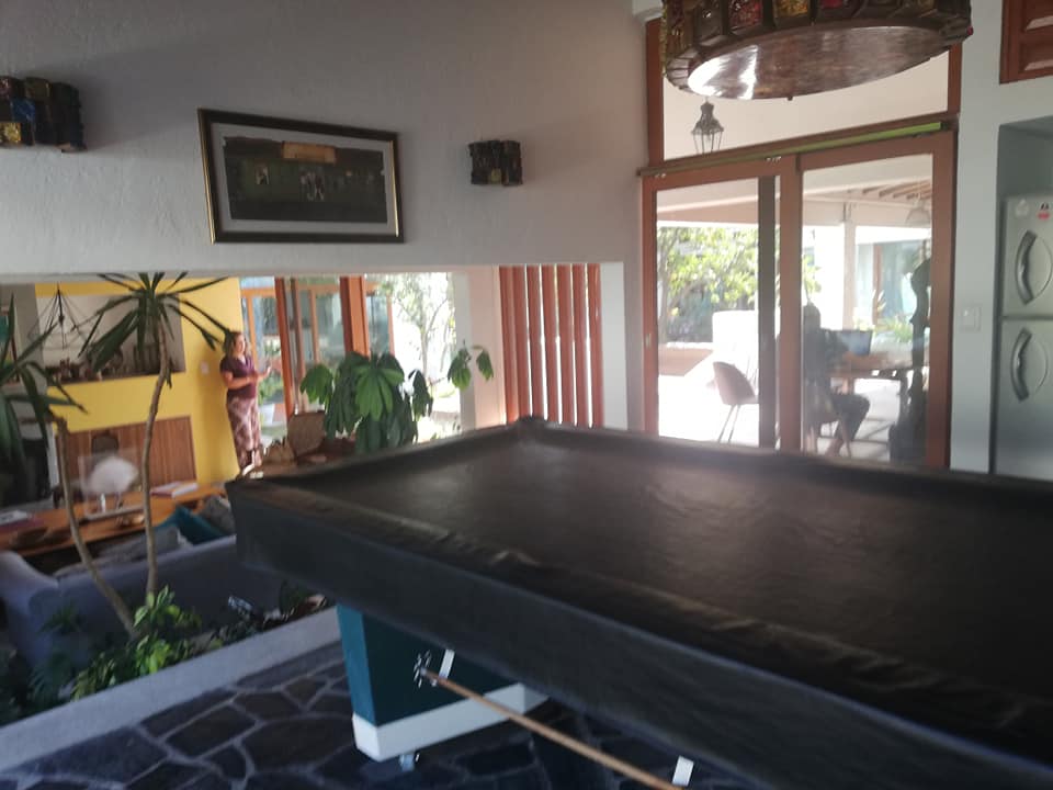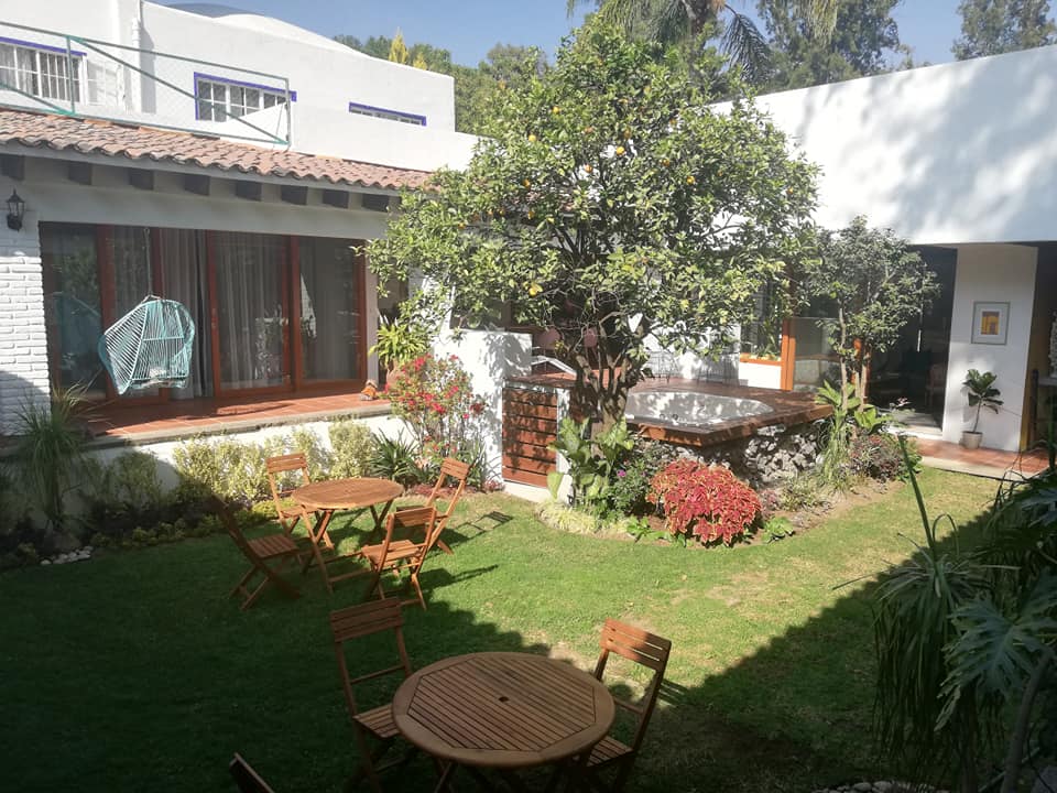Dos recamaras muy amplias con baño y vestidor, sala de T.V. con baño completo para visitas, sala, comedor, cocina equipada amplia, 2 terrazas, un bungalow con 2 recamaras y baño completo, alberca equipada y jardín. Terreno 451 mtr2 Construcción 344 mtr2