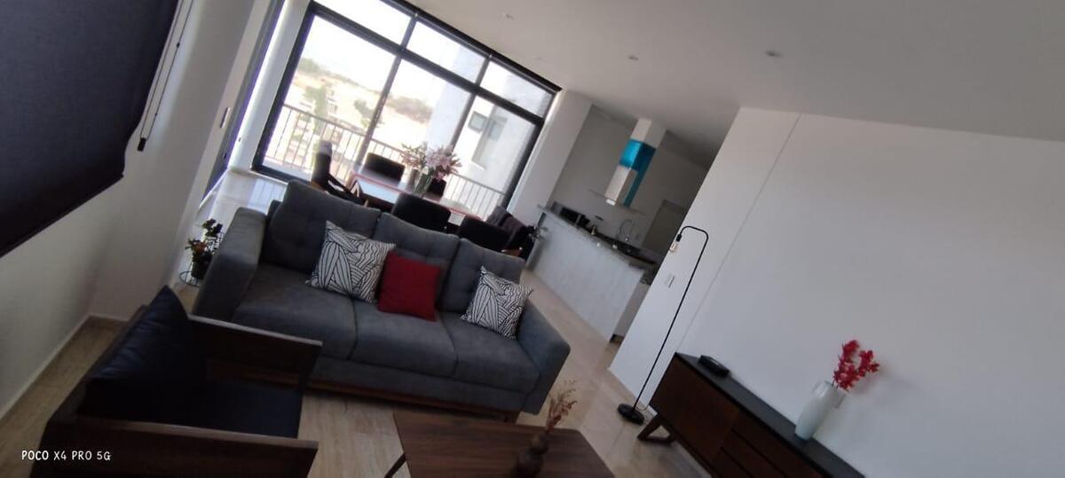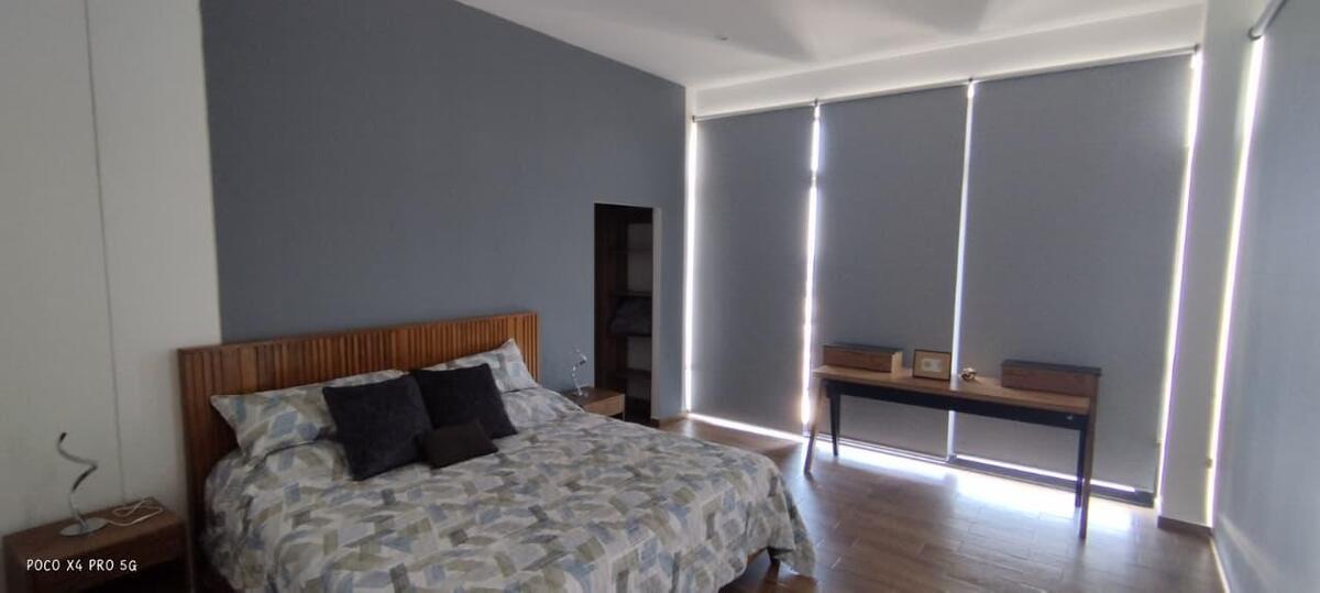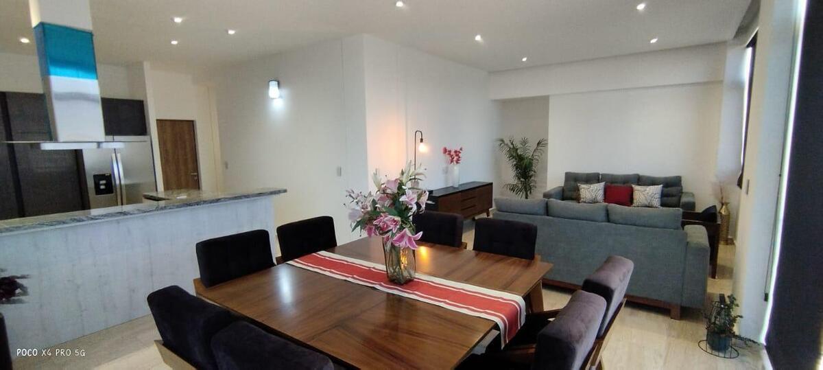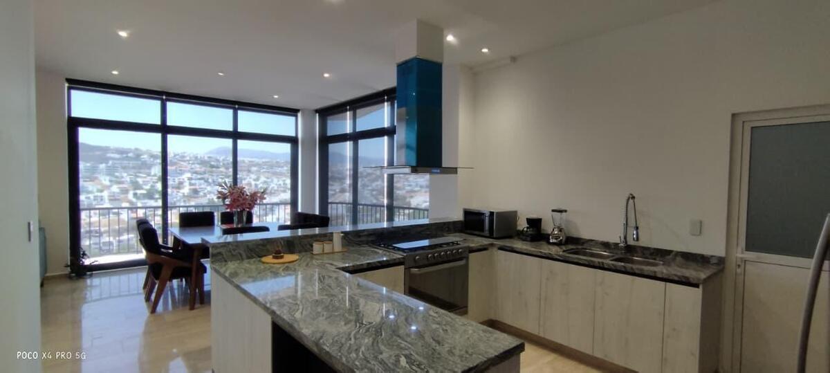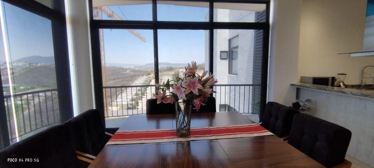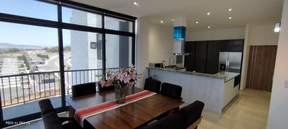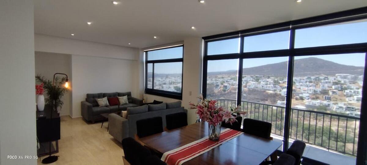 Penthouse de lujo en Juriquilla con recámara principal con vestidor y baño completo, dos recámaras secundarias que comparten un baño completo, cocina equipada con detalles de lujo, sala-comedor, dos cajones de estacionamiento, área de lavado, bodega y terraza; 222 m² de construcción, amueblado, completamente nuevo y con estacionamiento techado con vista a la reserva. Las áreas comunes incluyen elevador, áreas verdes, cancha de pádel, seguridad con dos filtros 24/7, gimnasio, área de asador, alberca y salón de usos múltiples con capacidad para 150 personas.